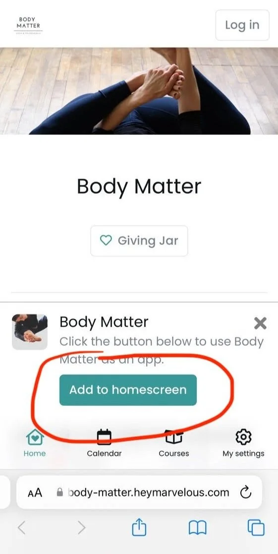How students can access the Body Matter studio site on Mobile and add an app to your phone