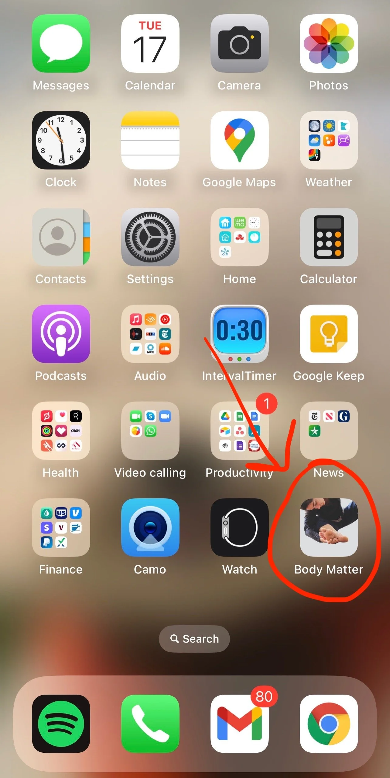 Visit https://body-matter.heymarvelous.com, on your mobile device in either the Safari mobile browser on an iOS device or Google Chrome on an Android device, you will see a pop-up at the bottom of the screen with the Body Matter app icon.
